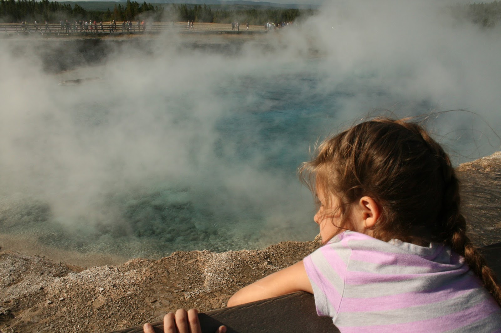 After admiring the waterfalls, we booked it across the park to see Old Faithful. We made it probably 15 minutes before it went off. Phew! The kids still got a good seat though.